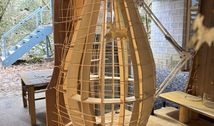 木型を組みガーゼ布に紙貼りをし、燻製炉のかたち、ボリュームをイメージします。